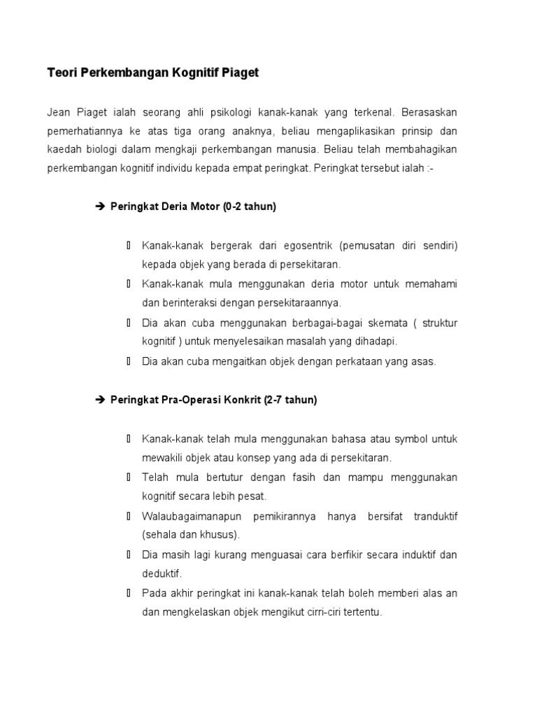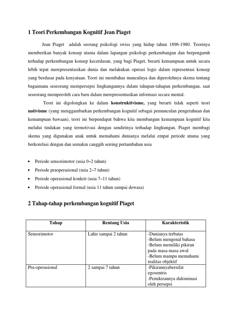 PDF Jean Piaget lahir di Neuchâtel Swiss 9 Agustus 1896 16 September 1980. Teori perkembangan kognitif oleh Jean Piaget memberikan batasan kembali mengenai kecerdasan pengetahuan dan hubungan anak didik dengan lingkungannya. 1 10 PENGENALAN Kemahiran kognitif merupakan kebolehan individu untuk berfikir memberi pendapat memahami.